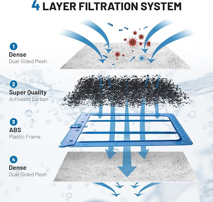 - 【Durable design, durable stability】 : Built-in ABS frame, uniform distribution of activated carbon and filter media, to ensure that every drop of water is fully filtered. ABS plastic edges are more durable and resistant to deformation, making them a perfect fit for Whisper filters