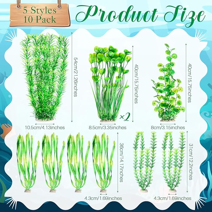 - Sufficient Quantity: you will get 5 styles of 10 green large artificial seaweed plants in total, sufficient quantity and rich styles to meet your fish tank aquarium decoration needs; Note: plastic aquatic plants may be squeezed and deformed during packaging, and they can be restored in warm water of 158-176 degrees Fahrenheit