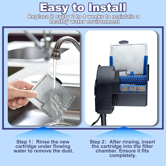 - Suggestions for Use: Suggest to change filter cartridge every 2-4 weeks. Regular cleaning or replacement of the filter cartridge helps to extend the service life of the fish tank filters,while the maintenance is simple, which helps to maintain the long-term stability of the water quality of the aquarium.