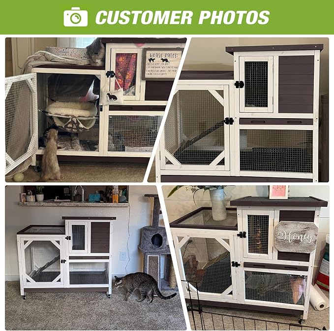 - 【Spacious Two-Story Design】Our rabbit hutches feature a unique two-story structure that provides plenty of space to explore and play.With a ramp connecting the lounge and activity areas, cute little pets can enjoy a cozy sleep.
